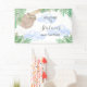 This cute baby shower banner is decorated with a watercolor of a sweet baby sloth hanging from a branch, framed with green jungle leaves and blue clouds.