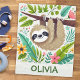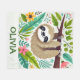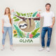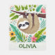 This cheerful personalized fleece blanket features a cute sloth hanging upside down from a tree branch, surrounded by colourful jungle leaves and tropical flowers. The sloth has a friendly, cartoonish style.