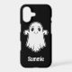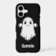 Destei's cartoon illustration of a cute ghost character with big eyes and a smiling face expression. The background colour is black. There is also a personalizable text area for a name or other custom text. This design is ideal for Halloween time, for example.