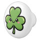 This kawaii shamrock nursery ceramic knob features a cheerful, three-leaf clover with a sweet, blushing face and large, sparkling eyes. With its thick, bold black outlines and vibrant green shading