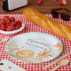 These charming baby shower plates feature a cute illustrated garden theme in a colourful design. A happy snail is pictured in the centre, crawling across a tree stump. A cute little lady bug is sitting on top of a yellow flower on the right side, and a couple of white daisies are pictured on the left. A faded image of the blue sky with fluffy clouds is pictured near the top portion and near the ladybug and mushroom.