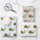 Cute wrapping paper with an pattern of a green snail in different colour backgrounds: blue, tan and yellow. Illustration and design by Patricia Alvarez.
