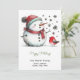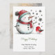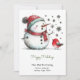 Cute snowman wearing a Santa hat and a red bird on a flat holiday card. Back of card is a pretty snowflake abstract design. Text can be changed. AI assisted graphic purchased with commercial use. Artwork: RedHeronLighthouse and RavenPrintableDesign
