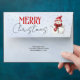 Cute snowman and snow Christmas holiday envelope. It features the typography "Merry Christmas", an endearing snowman dressed in a bright red scarf and hat and snowflakes on the flap, positioned on a gentle blue background.