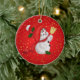 Brighten up your Christmas tree and give a touch of warmth and excitement of the holidays to your Christmas decoration with this charming circle ceramic Christmas tree ornament. Featuring a cute snowman holding a gold christmas bell against golden little stars on red background, this charming ornament is a perfect way to commemorate the holiday season with your family and makes a great gift for all of your loved ones.