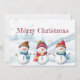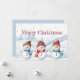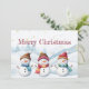 Send warm winter cheer with this flat Christmas card featuring three adorable snowmen in colourful scarves and hats against a snowy winter landscape. The front reads Merry Christmas in festive red lettering, while the back includes your personalized holiday message: