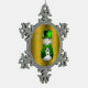 This adorable little snowman is dressed in green velvet, complete with top hat, vest and scarf. Behind him is a golden background and he is surrounded by green and gold stars. Made to stand out on your Christmas tree, or for decorating anywhere else in your house for the holiday season!