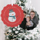 Send festive holiday greetings with a joyful Christmas keepsake your friends and family will treasure for years to come. This paper ornament card features a cute cartoon snowman wearing a classic top hat and scarf, set against a cheerful red background. Personalize the front with your custom greeting and family name in crisp white lettering that borders the design. The back of the snowman ornament card showcases your favourite family photo, making it a fun and heartwarming way to celebrate the season with loved ones.