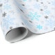 This cute pattern shows snowmen and snowflakes of different sizes on a light blue background, creating a fun winter scene.