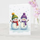 This beautiful card shows two happy snowmen as the main focus in a snowy winter setting. They are round and plump, with a 3D effect that makes them stand out against the white backdrop, with a hint of light blue snow at their feet. The snowmen are happy next to each other, spreading joy through their big smiles.