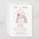 Impress your guests with our "Cute Some Bunny Is Turning One Girl First Birthday invitation" featuring a watercolor cute bunny rabbit wearing a pink bow sitting under a pastel rainbow, surrounded by small pink flowers.