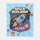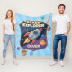 This playful personalized fleece blanket features a bold space explorer badge. In the centre of the badge is a playful cartoon rocket soaring through space with planets orbiting around it.