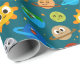 Wrapping paper with a cyan background featuring simple illustrations of suns, Earths, moons, stars, and planets with eyes. A fun and light design for kids' gifts and birthdays.