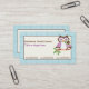 Cute spring owl on a branch with turquoise blue plaid border business cards, featuring a cute spring owl in purple and dark brown holding a flower in her beak (bill) on a branch with green leaves on turquoise blue plaid border. An adorable, feminine, decorative design for owl lovers. Artwork by Trina Clark.