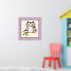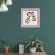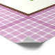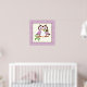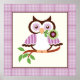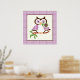 Cute spring owl on a branch poster print, featuring a cute spring owl in purple and dark brown holding a flower in her beak (bill) on a branch and purple plaid border. An adorable design for owl lovers perfect for nursery décor. Artwork by Trina Clark.