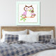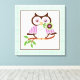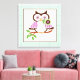 Cute spring owl on a branch wrapped canvas print, featuring a cute spring owl in purple and dark brown holding a flower in her beak (bill) on a branch and mint green plaid border. An adorable design for owl lovers perfect for nursery décor. Artwork by Trina Clark.