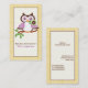 Cute spring owl on a branch with yellow plaid border business cards, featuring a cute spring owl in purple and dark brown holding a flower in her beak (bill) on a branch with green leaves on yellow plaid border. An adorable, feminine, decorative design for owl lovers. Artwork by Trina Clark.
