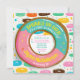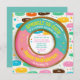 An adorable doughnut party invitation card with the design of a doughnut with icing ad sprinkles. The colours are teal, pink, yellow and other colours. Very fun, cheerful and cute.
