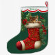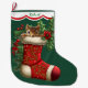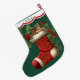 This Holiday stocking has an image of an adorable brown squirrel peeking out of an ornate red stocking. The image is surrounded by holly, red berries, and poinsettia blooms, and is placed on a Christmas green background. A white scalloped edge design bordered in red holds your customized name at the top. The back of the stocking is identical to the front.