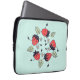 Kawaii strawberry laptop sleeve with a vector illustration depicting 5 happy smiling strawberry characters dancing in a circle surrounded by leaves and flowers of their own kind. Fun design with a spring spirit for a person who loves these yummy fruits.
