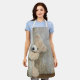 Apron with a darling photograph of a cute stuffed bear, standing by a rustic wooden wall / backdrop.