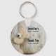 A baby shower (or other event) favour thank you key chain. Designed with a darling photograph of a cute stuffed bear, standing by a rustic wooden wall / backdrop.