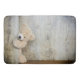 A bath mat with a darling photograph of a cute stuffed bear, standing by a rustic wooden wall / backdrop.
