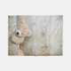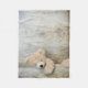 Blanket with a darling photograph of a cute stuffed bear, standing by a rustic wooden wall / backdrop.