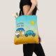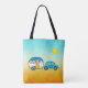 On our cute personalized travel tote for vacationers, road-tripping retirees, and full-time RVers, a small aqua car pulls a colourful blue and orange teardrop camper. The sky is clear, the sun is shining and you're in full travel mode. The text on front of the bag currently says, "Stephanie's Travel Tote" and can easily be personalized with your own name and words. Additional coordinating travel accessories are available.