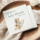 These cute baby shower napkins feature a watercolor teddy bear dressed as an astronaut, riding a rocket ship below the words "baby shower" in blue-green hand-printed font. Personalize the text with the name of the mom-to-be and the date in charcoal gray sans serif.