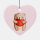 An ornament with a cute watercolor illustration. A brown teddy bear carrying a big red heart.
