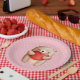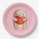 Paper plates with a cute watercolor illustration. A brown teddy bear carrying a big red heart. Light yellow polka dots on a pink background.