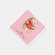 Paper napkins with a cute watercolor illustration. A brown teddy bear carrying a big red heart. Light yellow polka dots on a pink background.