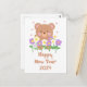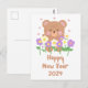 This design features a cute teddy bear with flowers on a white background and vibrant text "Happy New Year 2024". The year can be customized. This postcard is the perfect choice to spread joy this New Year!