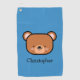 Cute brown teddy bear face with pink blushing cheeks pink ears and a happy face, on a blue background. A template below to add your name to personalize.