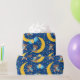 Cute and colourful baby pattern with an adorable teddy bear cartoon with a blue bow ribbon sitting on a sleeping moon holding balloons in yellow and blue and colourful stars, colourful balloons, stars, teddies and a name tag, with a dark blue background.