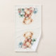 Towel set with a cute illustration featuring a Victorian style teddy bear. Wearing a fancy red bow. Drawn in a a cute old fashioned vintage style. Red and blue pastel Christmas presents surround this warm-hearted bear.