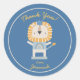 Thank You Stickers for baby and child birthday party favours, gifts, bags, prizes and more featuring a cute little lion wearing a rainbow shirt. Personalize with your own message and name. Dark blue background with white border