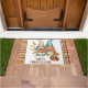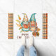 Cute Thanksgiving-themed front door mat features a pair of gnomes holding pumpkin and pie with Autumn coloured plaid background.
