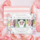 Delight your pre-school graduate with a celebration to mark the occasion using this cute girly photo invitation with an easy to use three-photo template. Insert your three desired photos in place of the sample photos used in this design. Tip: square photos work best, i.e. Instagram photos. Edit the sample text with your desired details. Pretty pink sketched watercolor flowers and stripes add trendy style to this design. Since all of the text in this announcement/invitation may be edited, you can also use it for other types of parties or events for any age.