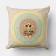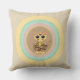 Fashion throw pillow with a cute tiger cat emerging from multicolored pastel circles on beige background.