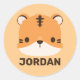 This design features cute tiger cartoon illustration with personalized name in brown modern sans serif font style on pastel orange background.