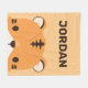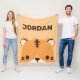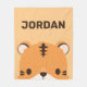 This design features cute tiger cartoon illustration with personalized name in brown modern sans serif font style on pastel orange background.