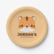 This design features cute tiger cartoon illustration with personalized name in brown modern sans serif font style on pastel orange background.