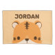 This design features cute tiger cartoon illustration with personalized name in brown modern sans serif font style on pastel orange background.