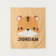 This design features cute tiger cartoon illustration with personalized name in brown modern sans serif font style on pastel orange background.