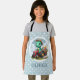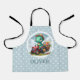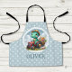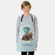 This personalized adorable kids' apron design features a charming little dinosaur joyfully driving a miniature red tractor carrying flowers on a pale blue and white polka dots background. With its playful expression and soft dreamy colours, this delightful creation adds a touch of enchantment to any space, appealing to everyone, especially kids and babies.