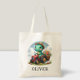 This personalized adorable, whimsical tote bag features a charming little dinosaur joyfully driving a miniature red tractor carrying flowers.