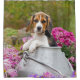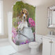 A young puppy-eyed tricolor Beagle puppy is sitting in a milk churn admist pink flowers The Beagle is a scenthound dog breed with a gentle temperament. A cute doggy photo taken by Katho Menden. This shower curtain is a gift idea for dog lovers.