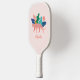 This cute pickleball paddle features a pink leopard and colourful tropical leaves. The back contains a matching pattern of tropical leaves. A text template is included for personalization, making this a great gift!